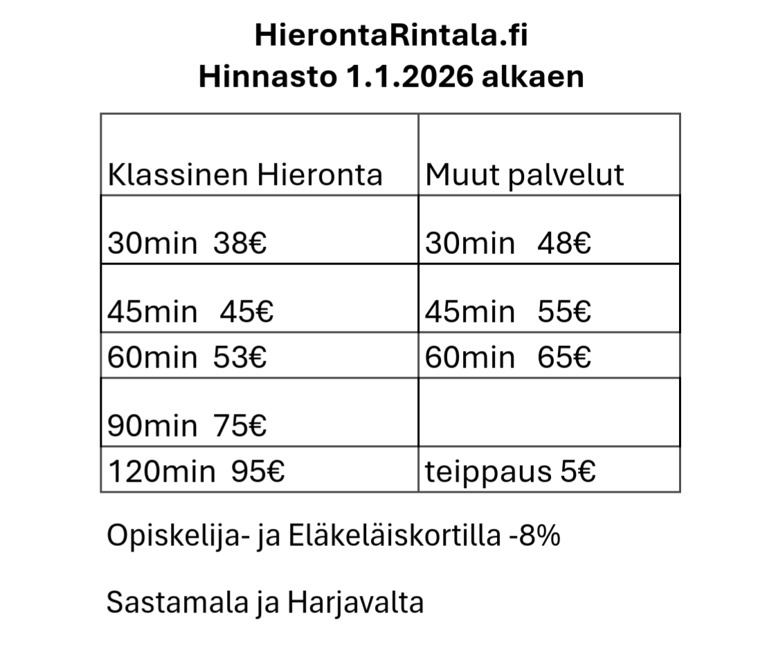 * Klassinen Hieronta rentouttaa ja lievittää kiputiloja. Pehmytkudosta ja lihaksia käsitellään hoitavin ja muokkaavin ottein.